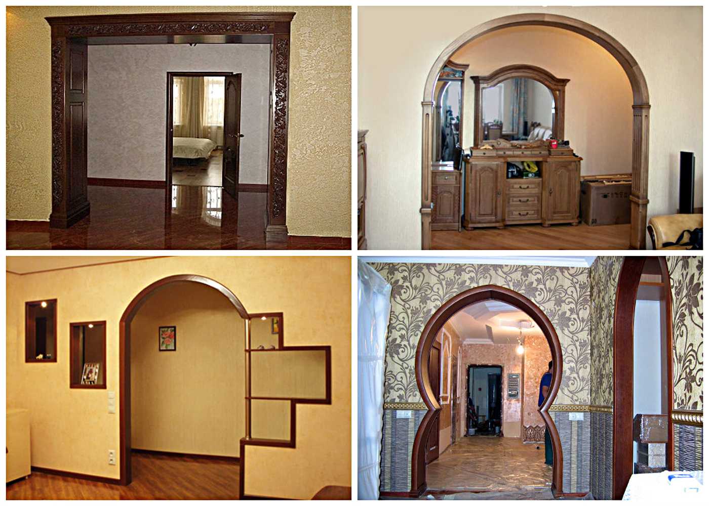 Простейшую прямоугольную модель можно собрать из и её обрамления, то есть используя наличники и комплект доборов. А вот для конструкций с гнутыми элементами понадобится терпение и правильные расчеты. Если вы не уверены в том, что сможете произвести изготовление деталей идеальной формы для сложных моделей арок, лучше остановиться на классическом варианте. Такое изделие будет достаточно простым в изготовлении и при этом способно визуально сгладить проход в помещение за счет закруглений по углам, которые, в принципе, выполнить будет не так уж и сложно.