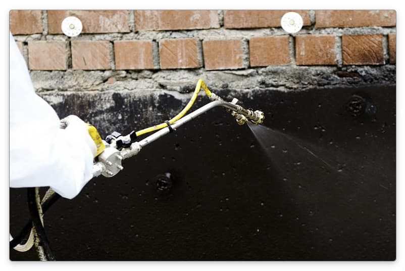 Вначале наружные стены основания обрабатывают битумной грунтовкой, на нее наклеивают рулонные материалы. Правильная методика — горизонтальное расположение снизу вверх, внахлест, но более простое — вертикальное.