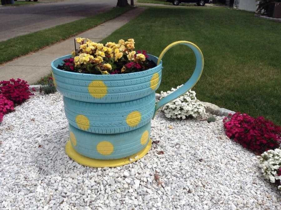 Отслужившие своё шины можно покрасить в различные тона и поставить друг на друга – в результате получится чудесный многоуровневый цветник. Великолепно будет смотреться и пирамидальная клумба. Для этого нужно взять шины разных размеров и сложить их одну на другую, начиная с автопокрышки большего диаметра.