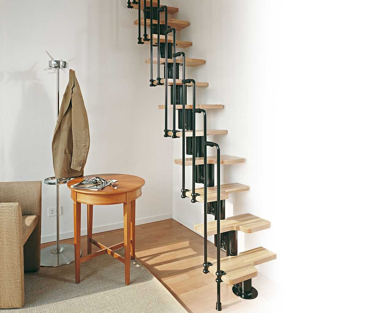 - Необходимо установить лестницу, соединяющую верхний уровень с нижним. Проще всего, конечно, отдать предпочтение модульной винтовой конструкции, которая занимает минимум места, и может при необходимости легко демонтироваться. Однако учитывая, что лестница – это единственный путь, по которому в такое помещение можно занести мебель, желательно предусмотреть достаточно широкий проём и маршевую лестницу из дерева или металла. Но это уже зависит от конкретных условий.