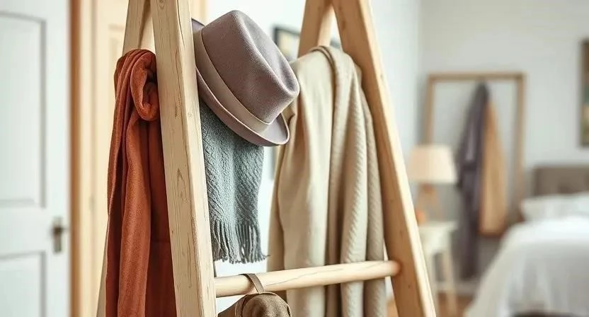 Превратить лестницу в вешалку для одежды и аксессуаров – просто и функционально. Достаточно прикрепить крючки к ступенькам, и у вас получится оригинальная вешалка в прихожей или спальне. Это особенно удобно для небольших помещений, где каждый сантиметр на счету.