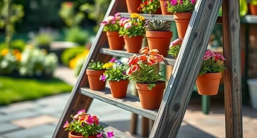 Создайте вертикальный сад на патио, используя старую лестницу. Разместите горшки с цветами и травами на ступеньках, и у вас получится красивый и функциональный элемент ландшафтного дизайна. Это отличный способ украсить террасу или веранду.