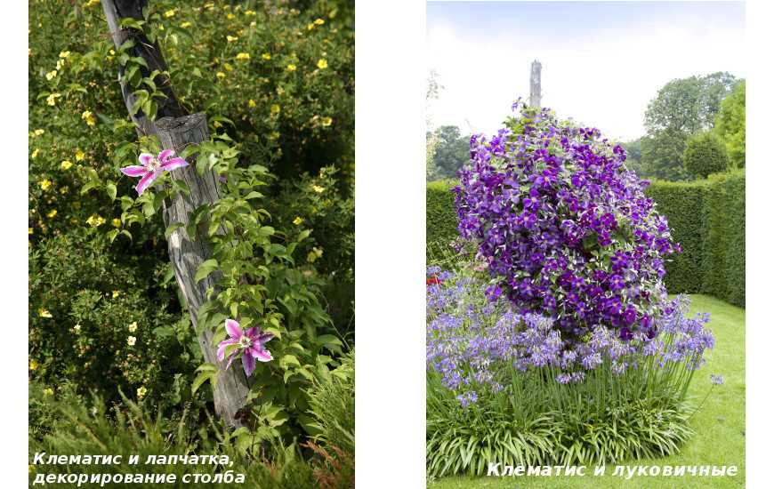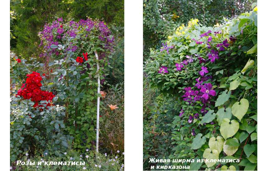 Розы и клематисы хрошо сочетаются с другими вьющимися растениями, а также цветущими однолетниками и многолетниками, декоративными кустарниками.