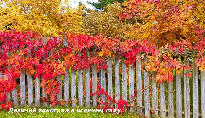 Девичий виноград в осеннем саду, оформление деревянного забора