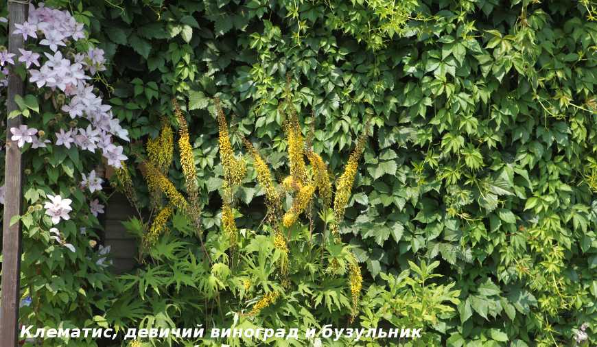 хмель, партеноциссус (девичий виноград) и зимостойкие виды культурного винограда. Они неприхотливы, отличаются быстрым ростом и прекрасно подходят для вертикального озеленения больших площадей — стен, заборов, простроных беседок и веранд.