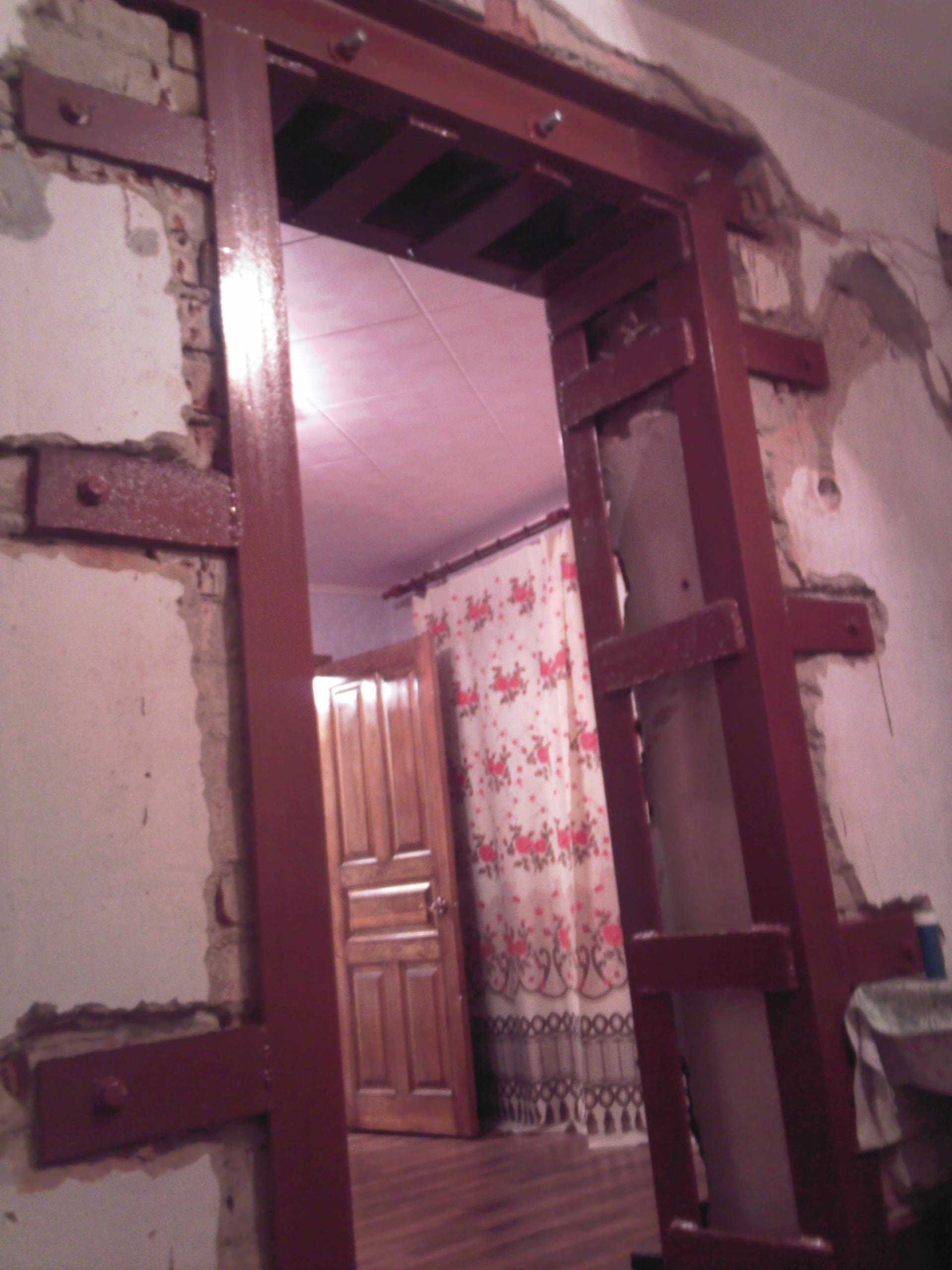 В пробитой стене делается обвязка проема. Для этого используют металлический швеллер. Можно установить уголки, предварительно приваренные друг к другу.