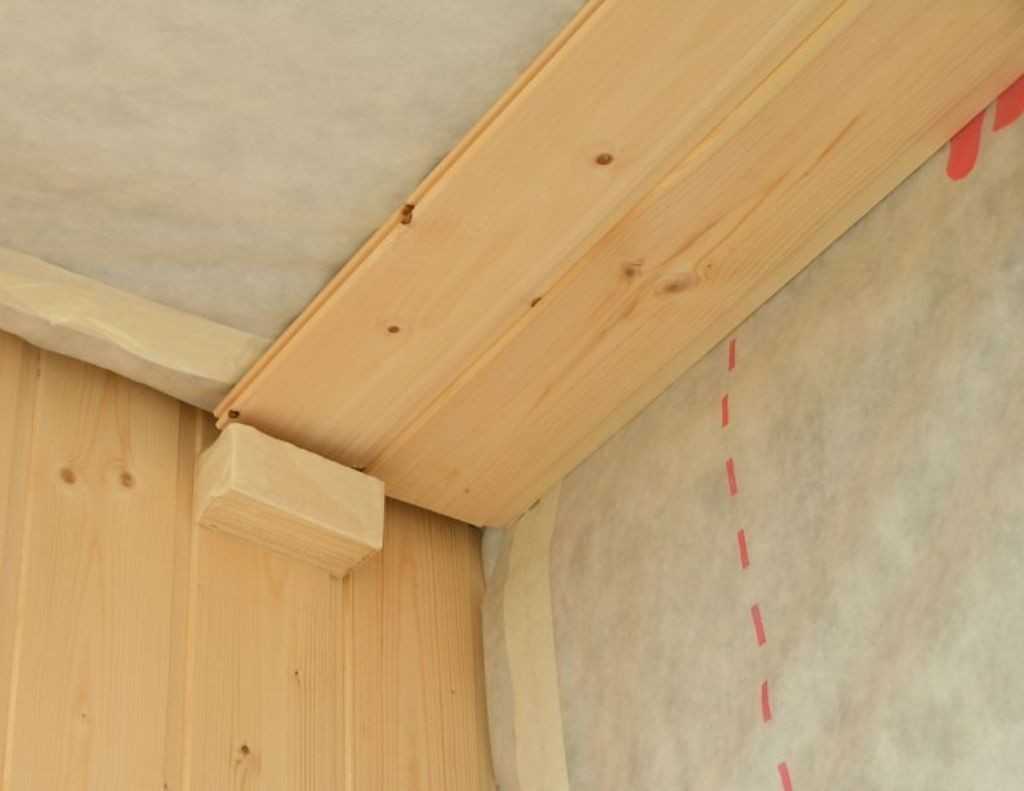 Еще один вариант – размещать из в пазах вагонки: если таковые не имеются, то лучше всего равномерно размещать точки крепления по всей поверхности потолка, применяя для этого декоративные шурупы. Иногда, для достижения полной незаметности точек крепления, обшивку приклеивают на качественный состав непосредственно к обрешетке. Обшивая потолок, нужно избегать плотного прилегания торцов обшивочного материала к стенам.