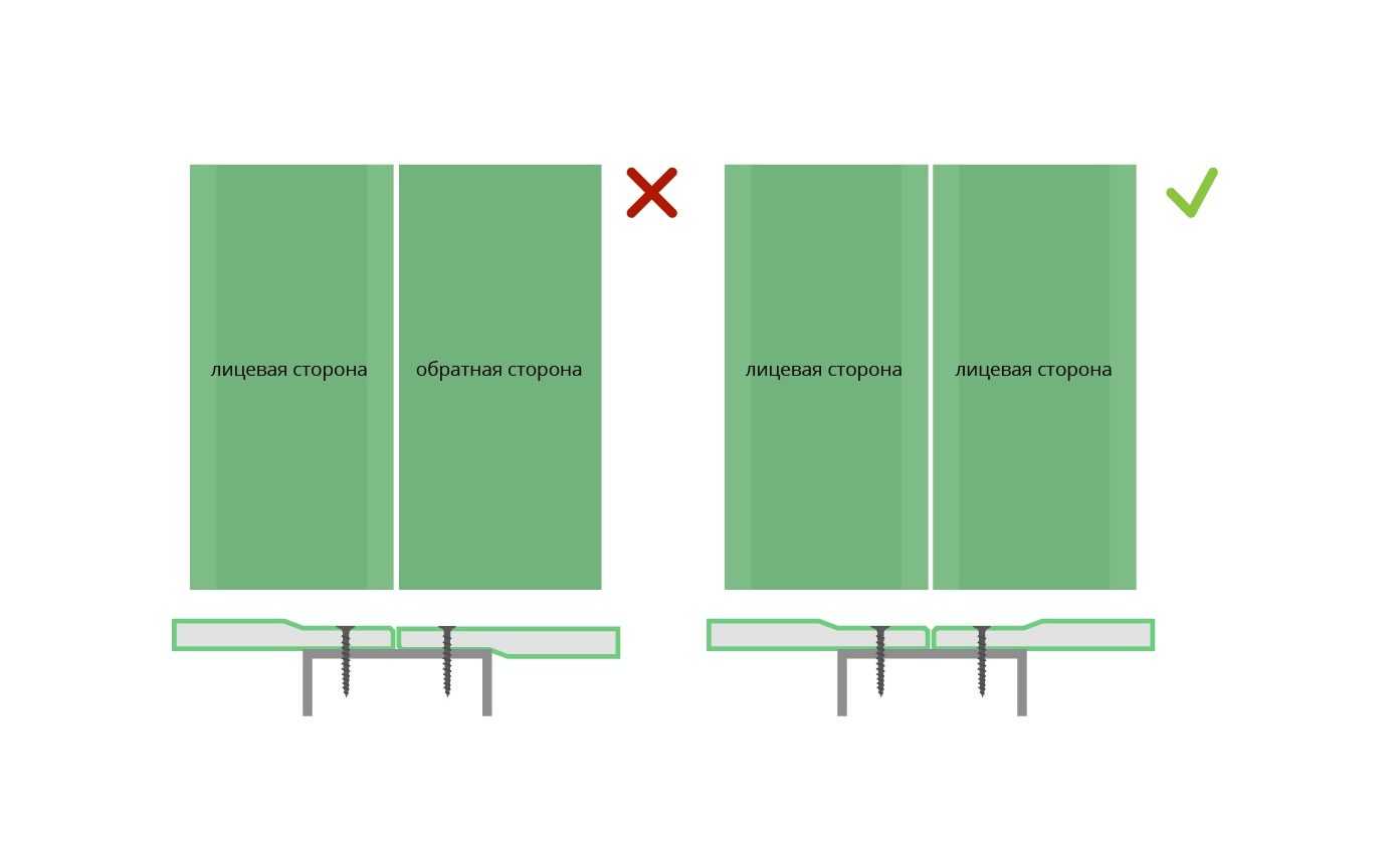 - Стыки листов должны находиться строго на брусе, монтаж листов с зазором в 1-2 мм.
