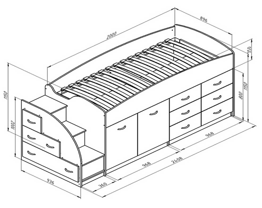 Сложность проекта зависит от того, какая модель кровати выбрана: с ящиками, полками, чердаком, домиком, трансформер или со вторым ярусом. Чем меньше жилплощадь, тем компактнее будет изделие. Чертежи кровати можно найти в сети — в бесплатном доступе масса готовых эскизов от дизайнеров.