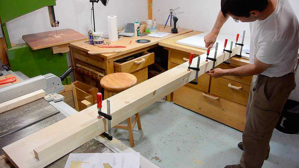 Далее в глухие отверстия подпускаем по каплям водно-полимерной эмульсии доверху. Когда впитается (это несколько минут), тонкой палочкой промазываем изнутри ПВА. Затем на плоскости наносим клей, как описано выше, сжимаем детали струбцинами и вгоняем сухие саморезы. Наносить клей на резьбу нет смысла – он при заворачивании выдавится по резьбе наружу. Клей же в отверстии саморез загонит в дерево; в его массиве образуется что-то вроде клеевой груши, прочно удерживающей детали, как якорь. Струбцины можно снимать через сутки после сборки.