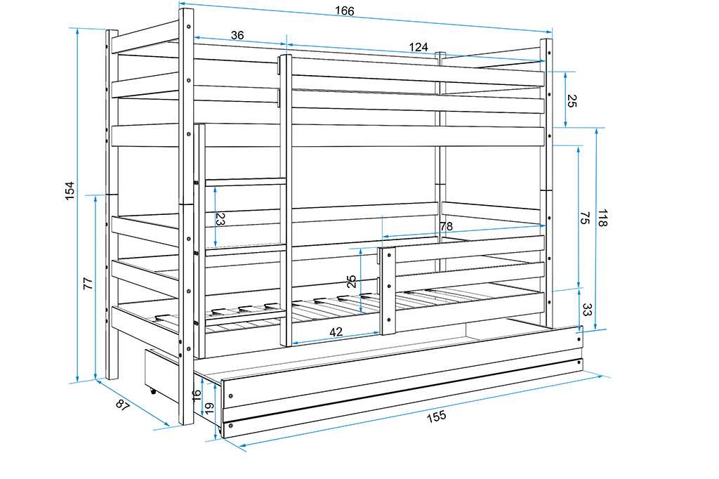 В состав каркаса конструкции для ребенка входят основание и спинки, что наглядно показано на чертеже кровати. Ширина и длина изделия определяется габаритами матраса. Нижняя часть кровати должна находиться на расстоянии от пола не более 35 см, что позволит ребенку без усилий забираться на нее.