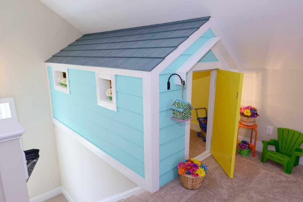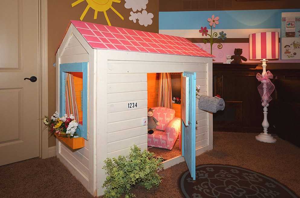 Если территория вокруг дома не позволяет разместить детский домик, то можно соорудить его внутри. В какой-то степени такое решение даже лучше, так как им можно будет пользоваться круглый год, а не только в теплое время года. Также домик будет защищен от воздействия неблагоприятных факторов, поэтому его срок службы значительно увеличится.