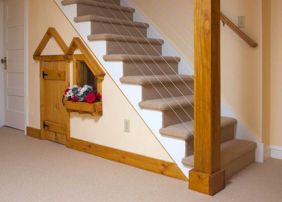 В случае, если размеры дома не позволяют выделить отдельную комнату для создания игровой зоны с домиком, рекомендуем преобразовать пространство под лестницей. Зачастую оно не используется рационально, а остается пустым. Поверьте, оно отлично подойдет для создания небольшого, уютного домика для игр. К тому же, если его немного украсить и добавить декоративных деталей, он будет выглядеть здорово!
