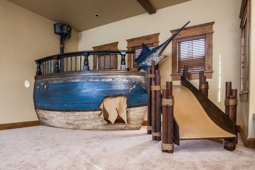 Дети любят оригинальное исполнение. Замок принцессы, жилище хоббита, пиратский корабль — лишь немногие идеи для воплощения. Хорошо, если жилище получится дополнить лесенкой, горкой, спортивными снарядами.
