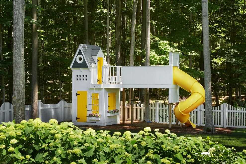 К примеру, некоторые производители создают большие дома с внутренним наполнением. Очень красиво смотрятся двухэтажные конструкции с разными горками и лесенками. Такие варианты отлично подходят для размещения на заднем дворе частного дома или на территории дачи.