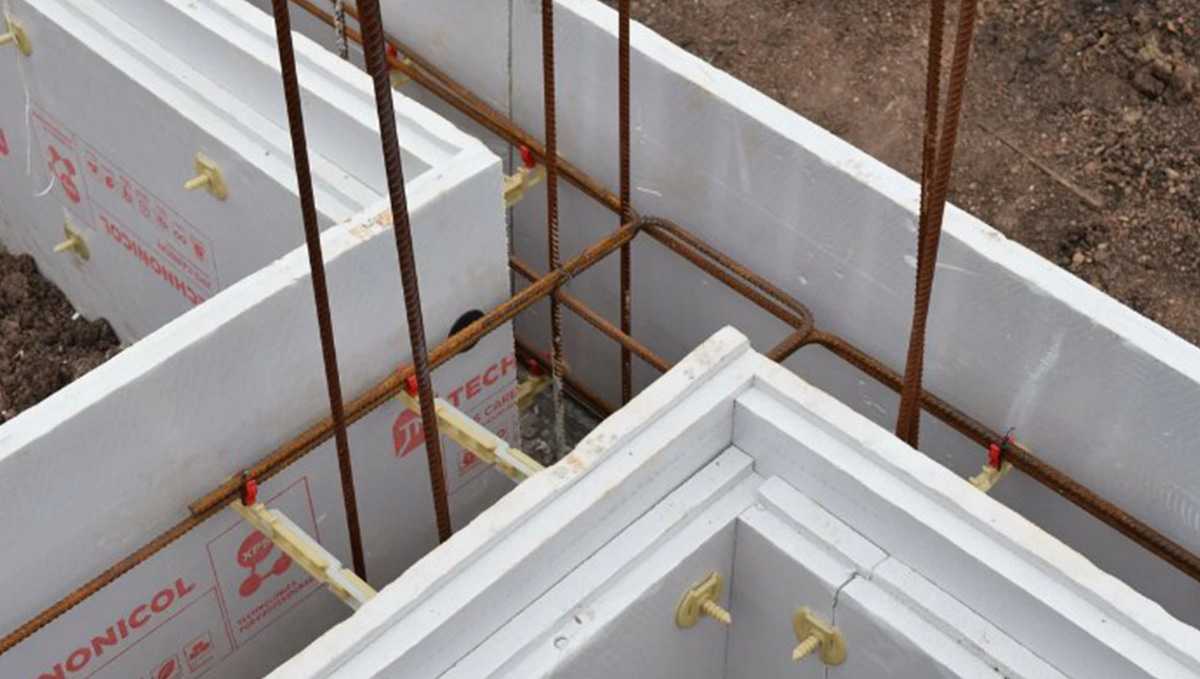 Высота блока в зависимости от модификации составляет 250 или 500 мм. Блоки устанавливаются по всему периметру дома на высоту 1 метр, затем армируются двойной сеткой арматуры диаметром 10 мм и заливаются бетоном. В углах армокаркас дополнительно усиливается. Средняя скорость возведения дома составляет 1 этаж за неделю.
