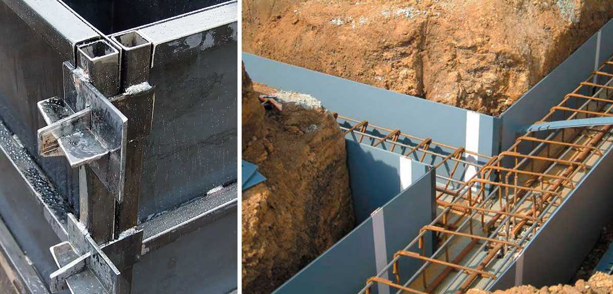 Несъемную опалубку можно сделать самостоятельно из влагостойкой фанеры, цементно-стружечных плит или листов плоского шифера. Она получается достаточно прочной, устойчивой к воздействию влаги. Однако стена имеет невысокие теплоизоляционные свойства. Поэтому потребуется утепление здания, например минеральной ватой. Также понадобится усиленная гидроизоляция и стяжной крепеж.