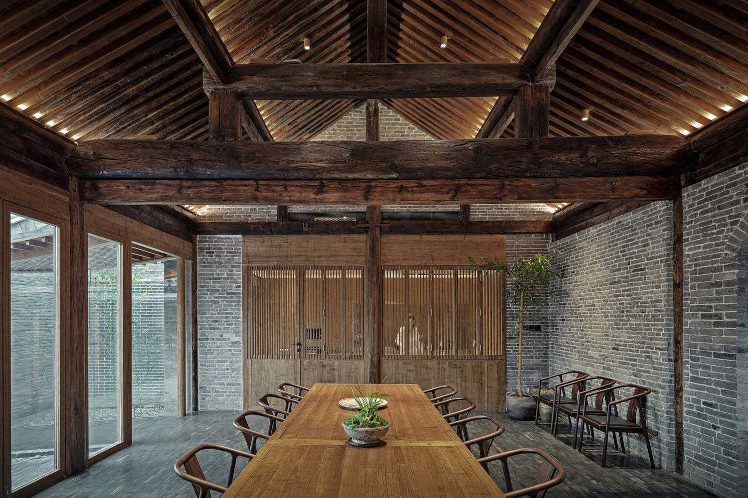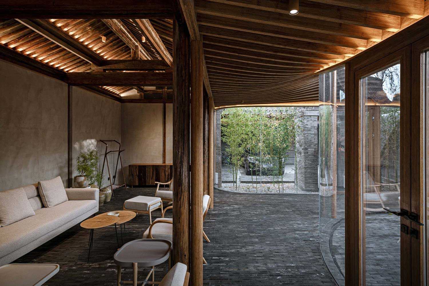бамбуковые панели, балки, стекло. Построенные части внутреннего двора выглядят