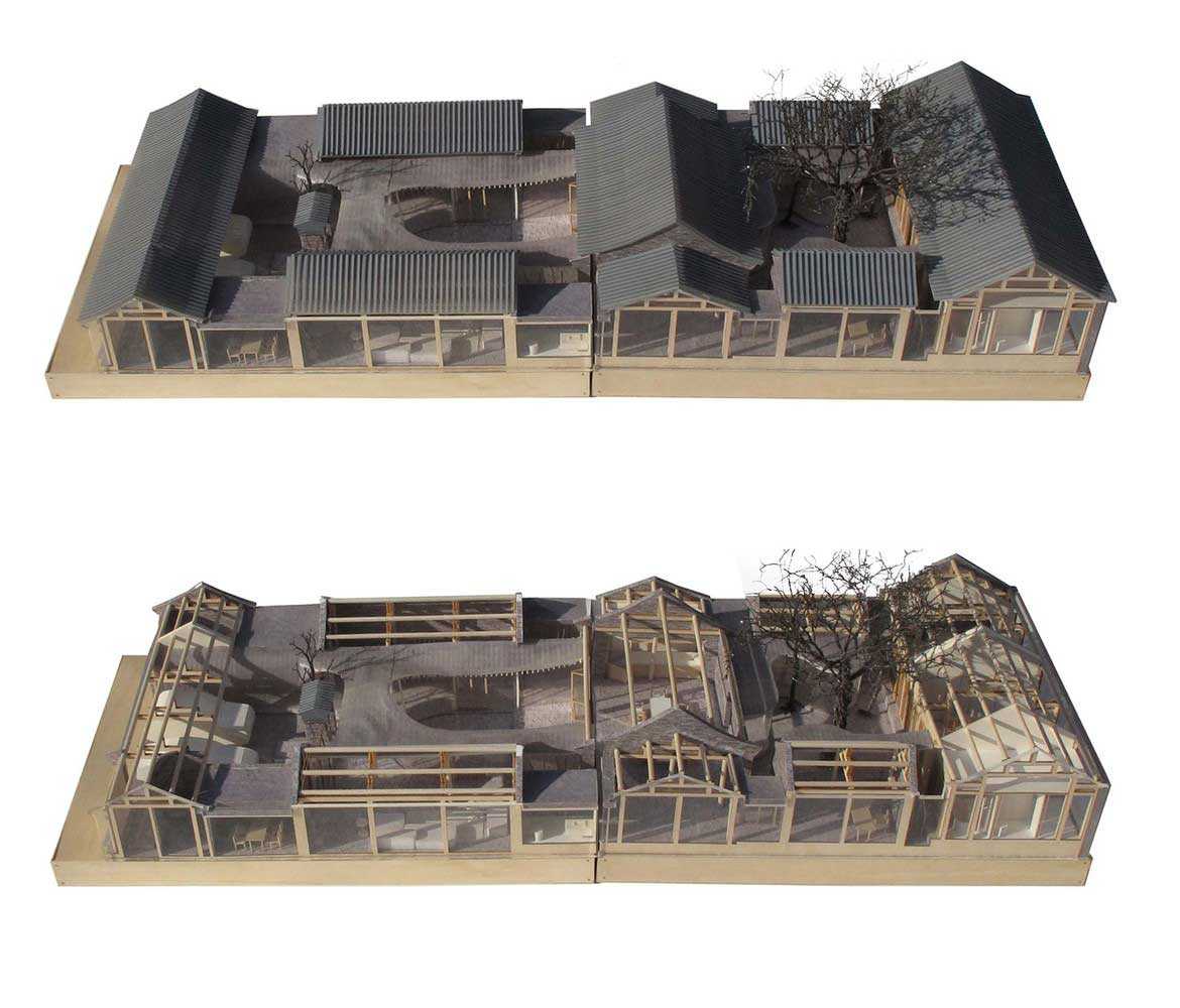 Планируя оформить красивый двор частного дома, владельцы жилья часто забывают о том, что это открытая площадка, над которой светит солнце, падают осадки. Архитекторы часто используют комбинированную планировку двора. На примере китайского проекта мы видим, что часть внутренней площадки открыта для солнечного освещения, а часть закрыта плоской крышей. Таким образом создаётся некий переход отдыха на свежем воздухе к обустройству в зоне закрытого комфорта.