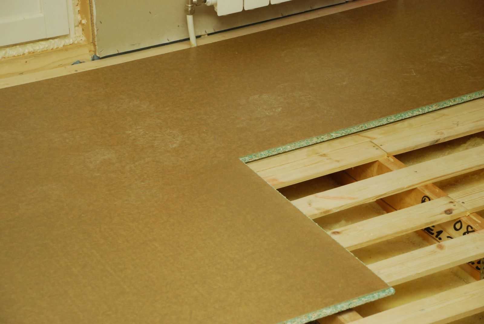 Бруски монтируют непосредственно к ветхому древесном основанию, и там где отсутствую доски в основании, заместо их под лаги устанавливают отрезки бруса или другие кусочки деревянной породы. Не рекомендуется делать частичную обрешетку из лаг или оставлять под ними зазоры в полу, перед тем как выстилать ДВП. Перед укладкой их на пол стоит напомнить, что для предварительного пола, в качестве подложки под линолеум, паркет или ковролин, используют наименее дорогие плиты с маленький шириной, а для финальной отделки — высококачественный жёсткий оргалит.