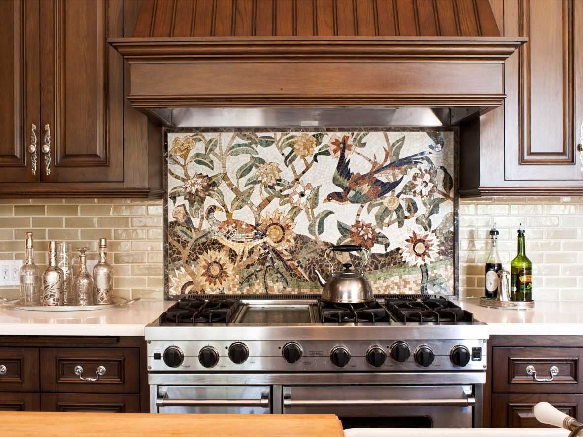 Особое внимание уделяют зоне приготовления пищи, под вытяжкой. Дополнением может служить панно или полоски с растительным или рельефным орнаментом, геометрическими строгими или объемными рисунками, узор из плитки другого цвета
