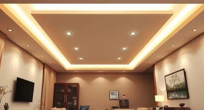 - Многоуровневый потолок в гостиной с разными типами освещения
