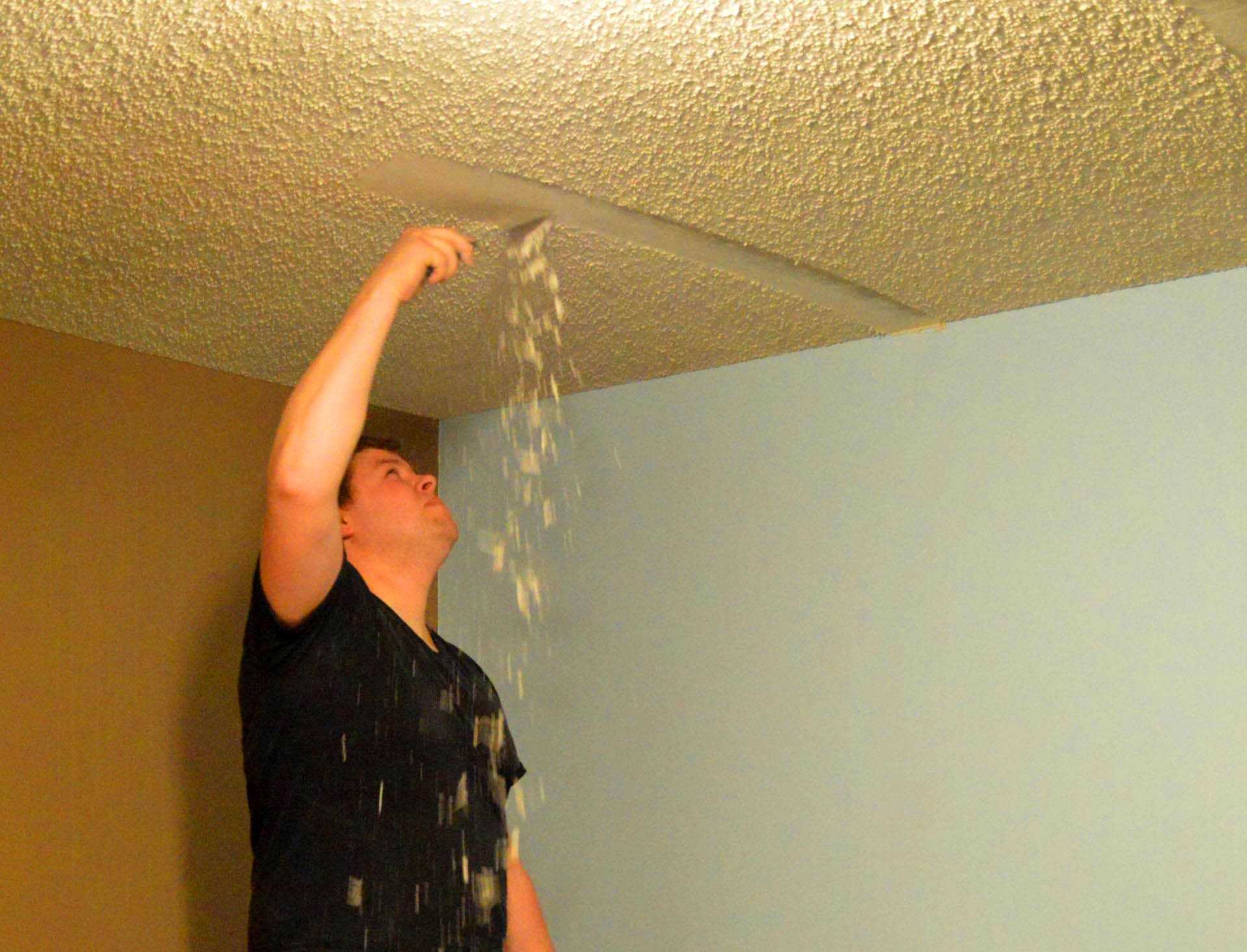 Второй пункт подготовки – удаление старых отделочных материалов. Если потолок был покрыт раньше толстым слоем штукатурки или краски, то все это необходимо удалить, иначе тяжелые куски старой отделки могут повредить каркас или сами панели.