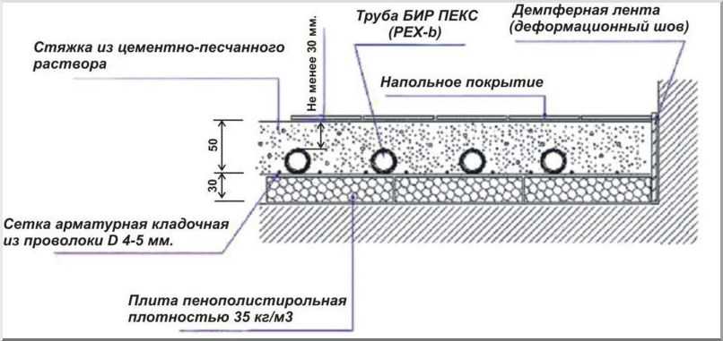 Если водяной теплый пол по своей конструкции предполагает использование труб с сечением в 25 мм, то минимальная толщина обустраиваемой стяжки будет составлять 40 мм, чтобы обеспечить нужную эксплуатационную прочность. Для такой тонкой стяжки предварительно предусматривается выполнение операций по выравниванию чернового пола. Не допускается минимальная величина в помещениях с интенсивной проходимостью.