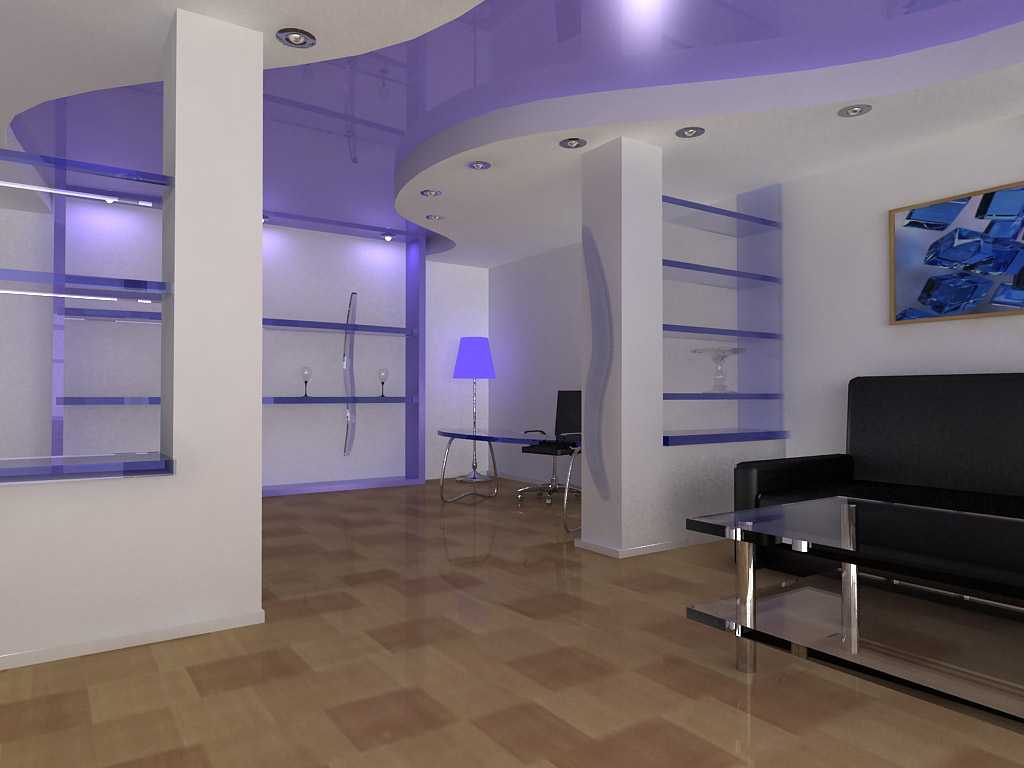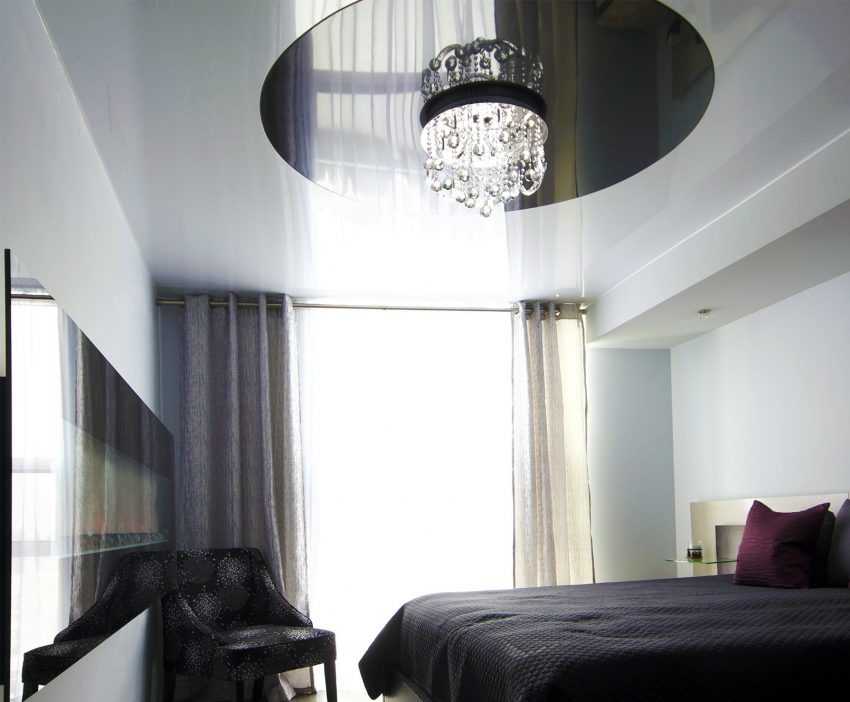 Кроме того, поверхность пленки отражает все находящееся в комнате, бликует. Это свойство надо учитывать, и использовать (если есть возможность). Темные полотна (черные, фиолетовые, синие) создают эффект углубления пространства, зрительного увеличения объема комнаты и высоты потолка.
