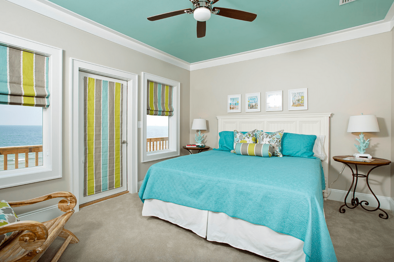 Если окна выходят на запад или закрываются деревьями, потолок и стены в них лучше покрасить в яркие и тёплые оттенки. Солнечно-желтый или оранжевый хорошо подходят для комнат с плохим естественным освещением. К тому же, такое помещение будет значительно уютнее зимой и осенью, когда солнца катастрофически мало. В помещениях на южной стороне дома как правило потолок красится в более холодные цвета, например, светло-зелёный или бирюзовый.