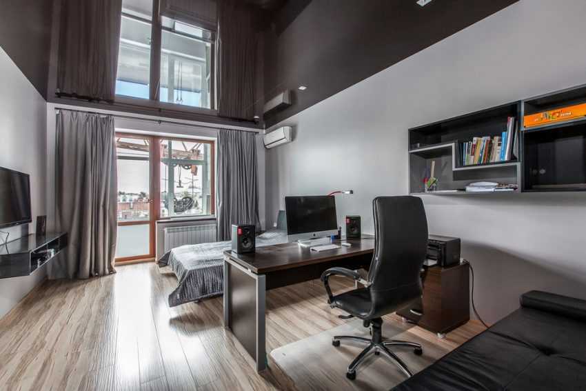 - Желательно, чтобы между потолком и стенами был контраст. Если натяжной потолок — светлый, то стены должны быть темнее и наоборот.