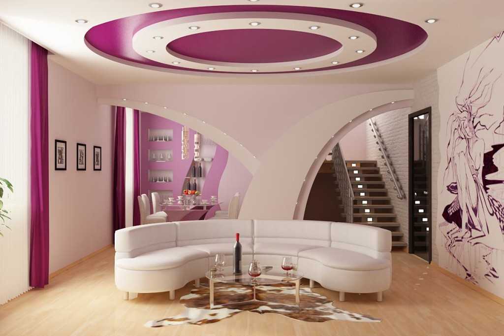 Но подавать такое «блюдо» следует с осторожностью, в больших количествах фиолетовый – сильный депрессант, а потому мало кто решается изготавливать в таком тоне полностью весь потолок, ограничиваясь лишь небольшими вставками