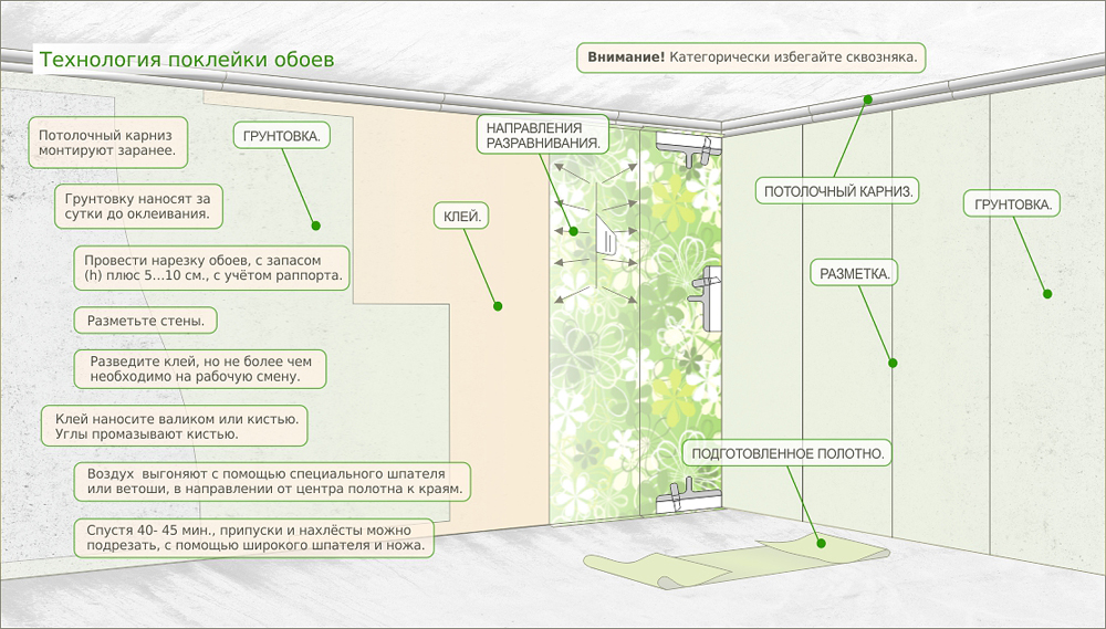 - перед поклейкой нужно убедиться, что в помещении нет сквозняков. Крайне не рекомендуется включать в процессе вентиляторы или кондиционеры и открывать окна;