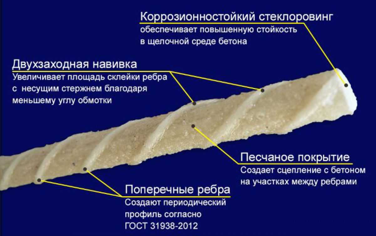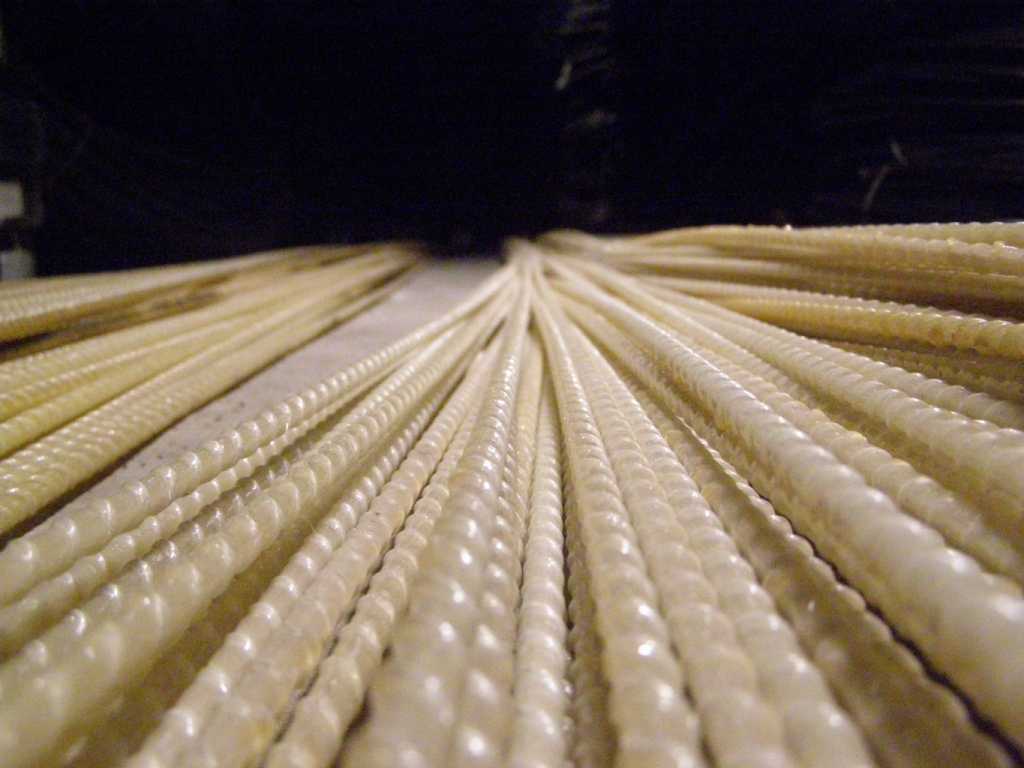Для лучшего сцепления с бетоном на прутья наматывается тонкий шнур. Он сделан из того же самого материала, что и основной стержень. Шнур создает винтовой рельеф, как у стальной. Твердение эпоксидной смолы происходит в сушильной камере. На выходе из нее композитную арматуру немного вытягивают и нарезают. Некоторые производители до момента твердения полимера обсыпают пластиковые стержни песком для улучшения сцепления с бетоном гладких участков.