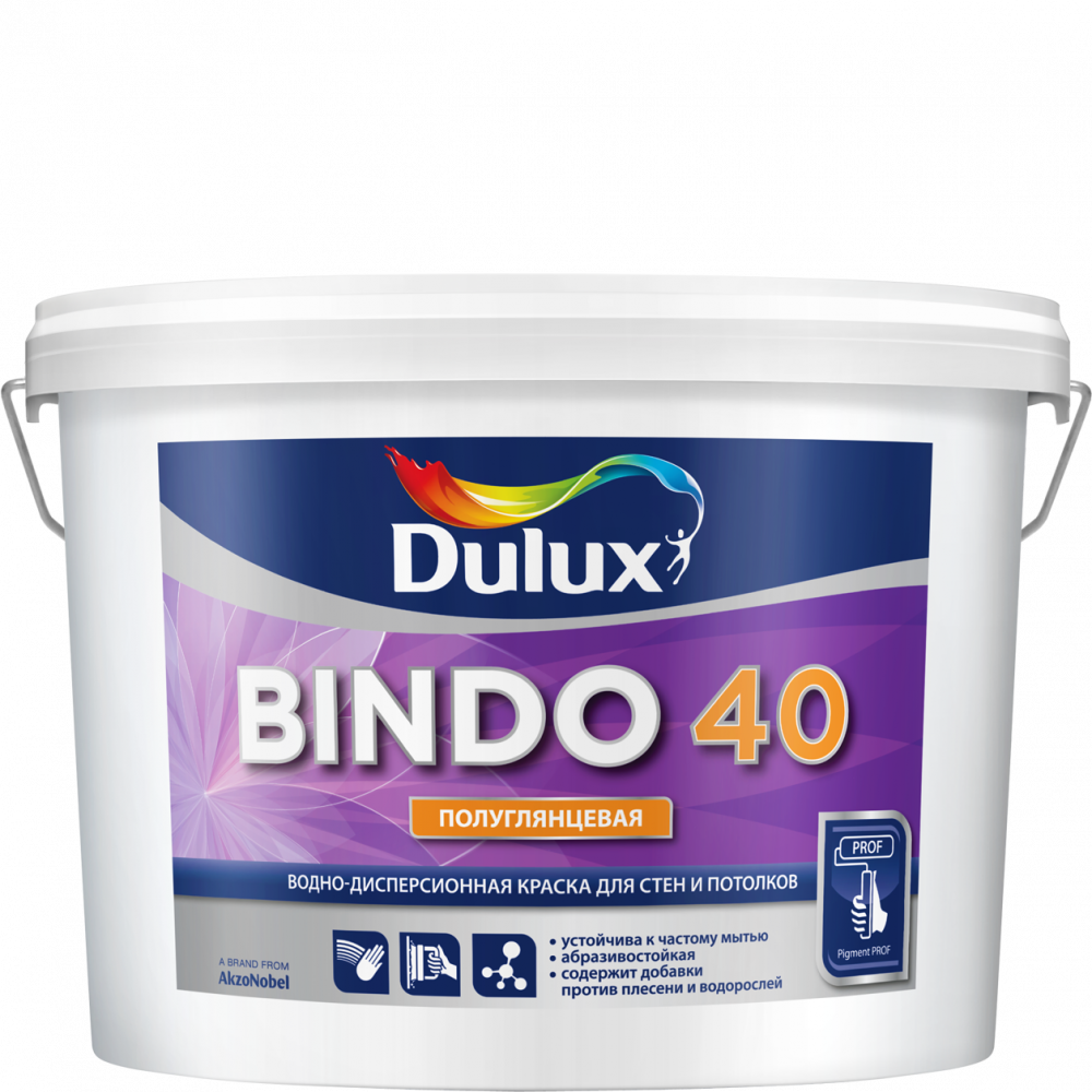 Dulux Bindo 2, 3, 7, 20 – состав дополнен белым пигментом диоксида титана (TiO2) благодаря чему покрытие легко наносится, быстро сохнет. Отлично скрывает все дефекты стены. Краска с маркировкой 40 имеет повышенную прочность покрытия и подходит для помещений с высокой влажностью.