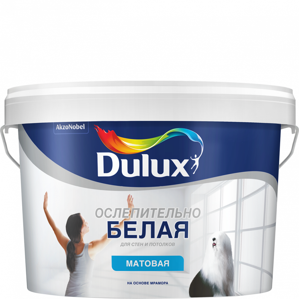 Dulux Новая ослепительно белая 3D White и Ослепительно Белая – помимо всех качеств, относящихся к продукции делюкс, краски имеют бархатистую основу благодаря входящему в состав компоненту – мраморной крошке. Насыщенный белый цвет отражает свет и визуально увеличивает пространство.