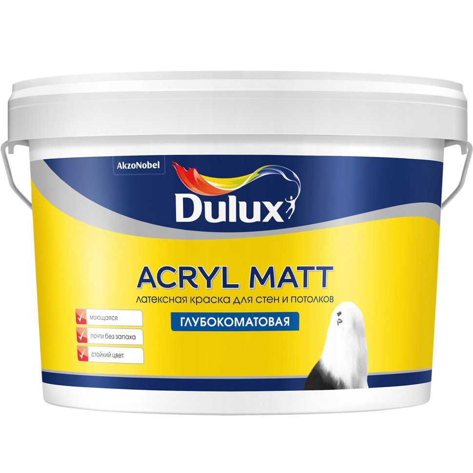 - Глубокоматовая латексная краска Dulux Acryl Matt может длительное время сохранять свой цвет, не выцветать, применяется она для внутренних и наружных стен как для умеренно влажных помещений, так и для комнат с повышенным показателем влажности. Покрытие моется обычной водой без использования каких-либо средств.