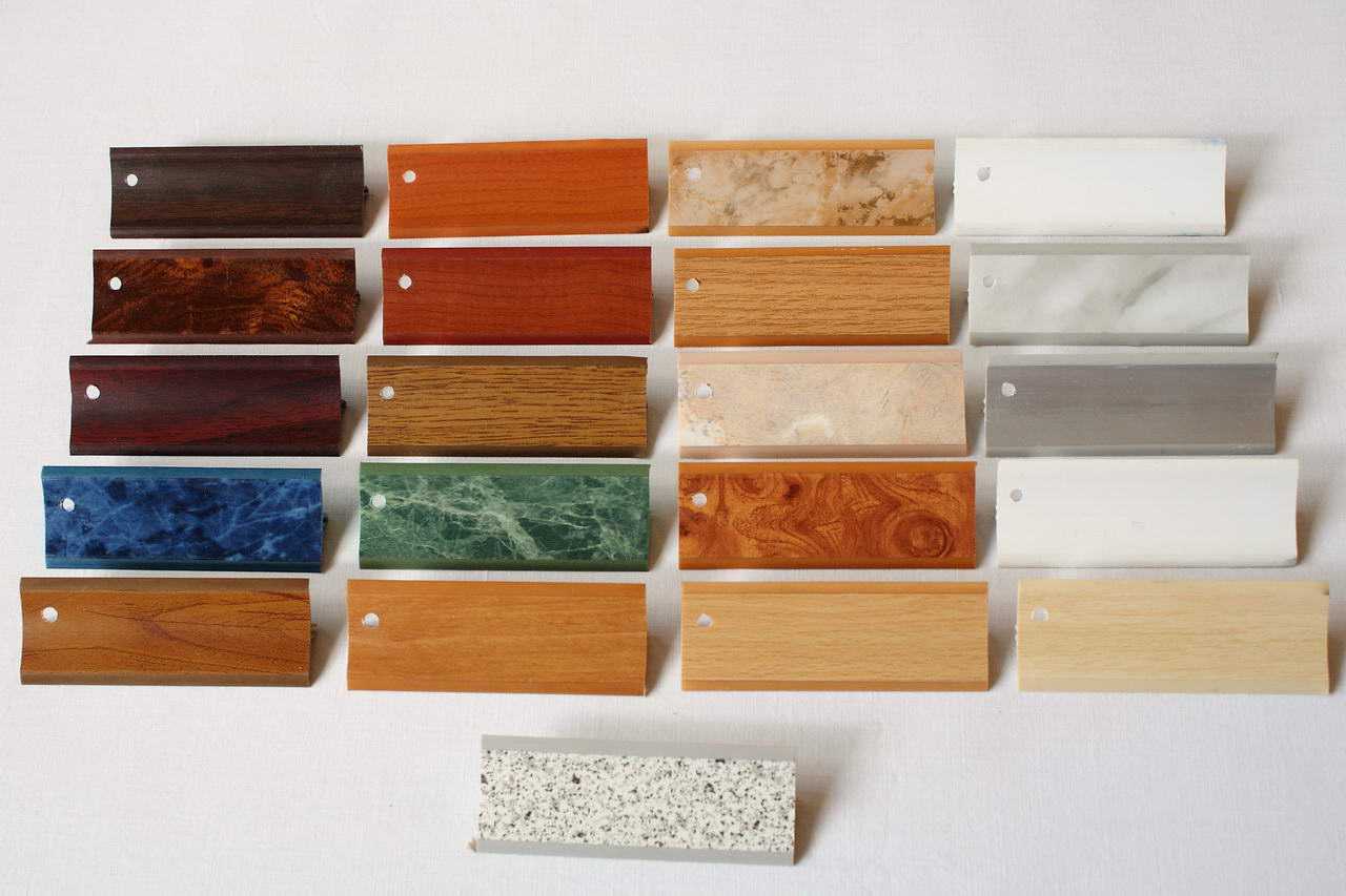 Пластиковые плинтуса для столешниц производят на основе поливинилхлорида путем коэкструзии. Из расплавленной массы можно создать плинтус любой формы и размера. Необходимый декор получают либо окрашиванием в массе, либо ламинированные пленкой с имитацией текстуры благородных материалов. Обычно молдинг декорируют под разные сорта дерева и породы камня. Фактура багета может отличаться: если глянцевые и матовые изделия, гладкие и шагреневые.