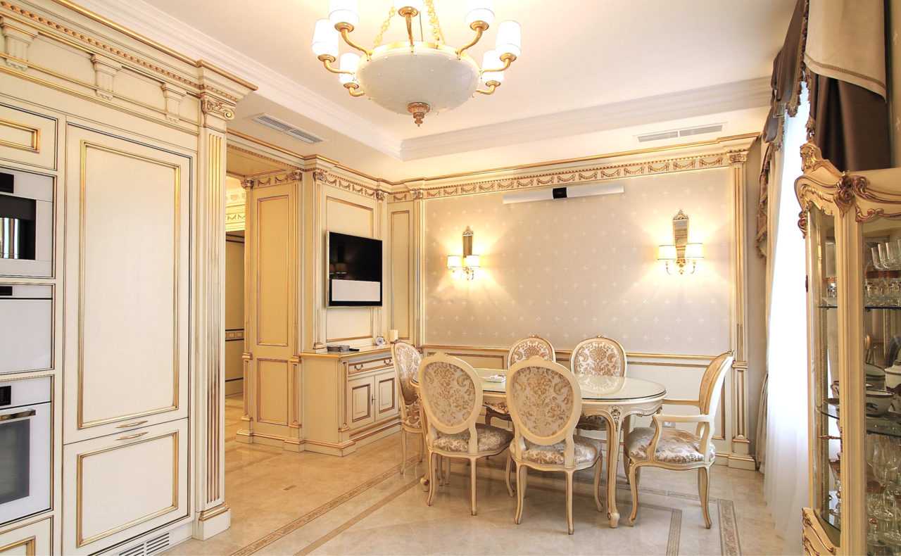 Кухня-столовая – это та самая комната, где можно дать своей фантазии волю. На кухне хорошо будет смотреться абсолютно любой стиль. Сейчас активно добавляют в интерьер лепнину на стену, которая нерабочая. Она имитирует 3D-эффекты или как вариант колонны необычный форм и размеров.
