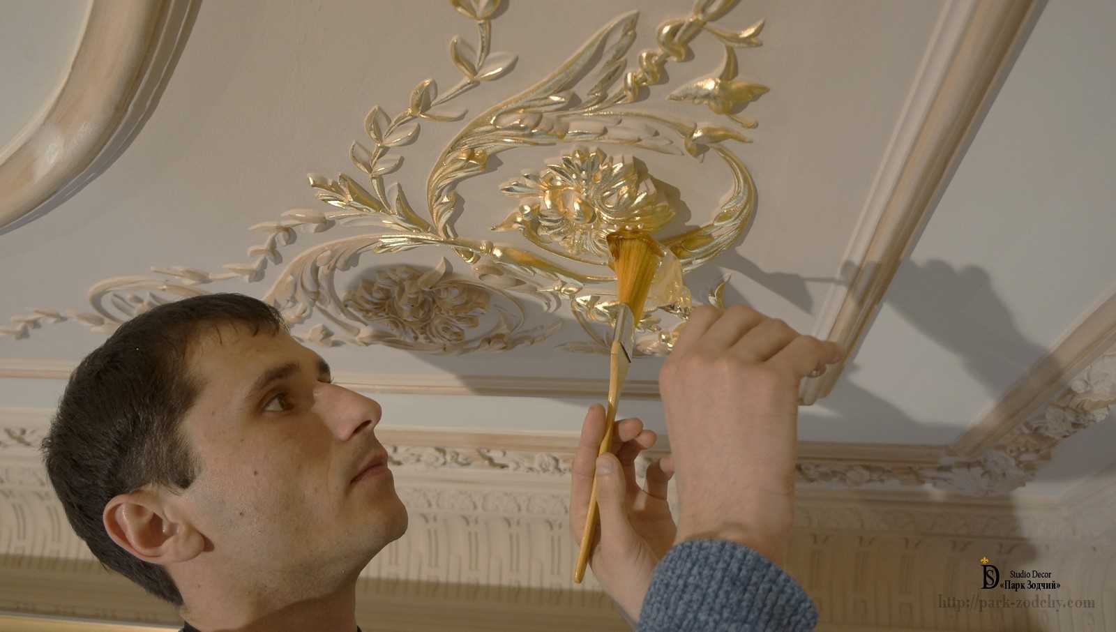 Более дорогой способ оформления лепнины — сусальное золочение. Для этого используются тонкие листы чистого золота. Технология требует специальных навыков.