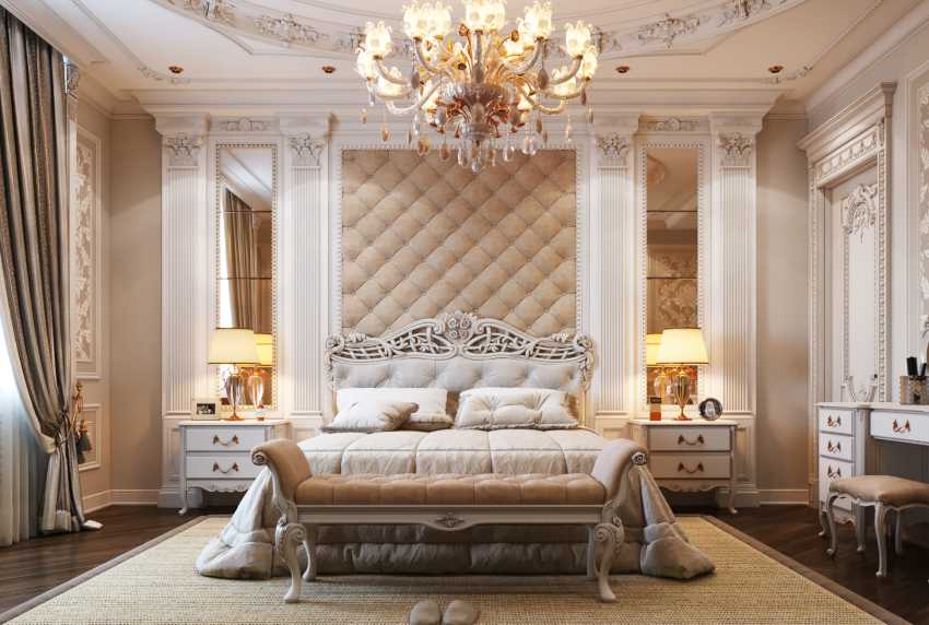 Ампир: роскошный стиль, в котором присутствует строго симметричная белая или позолоченная лепнина с геральдическими мотивами.