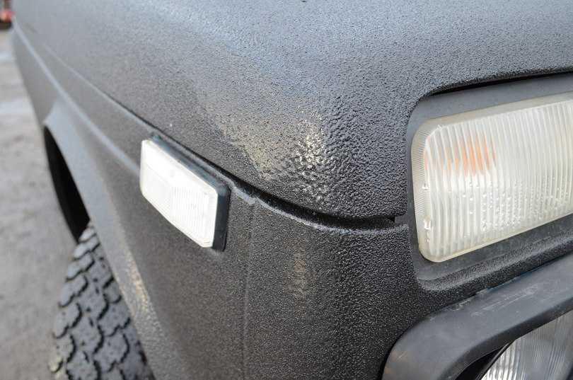 К недостаткам молотковой краски можно отнести ее неустойчивость к тормозной жидкости и плохое прилегание к акриловому грунту.