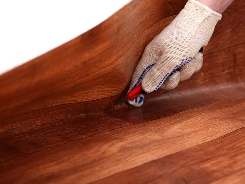 Если вы приняли решение не снимать старый слой, но на нем есть различные дефекты и потертости, то вам нужно будет аккуратно вырезать их. Резку рекомендуется осуществлять квадратами или прямоугольниками, чтобы затем можно было качественно вклеить новый материал.