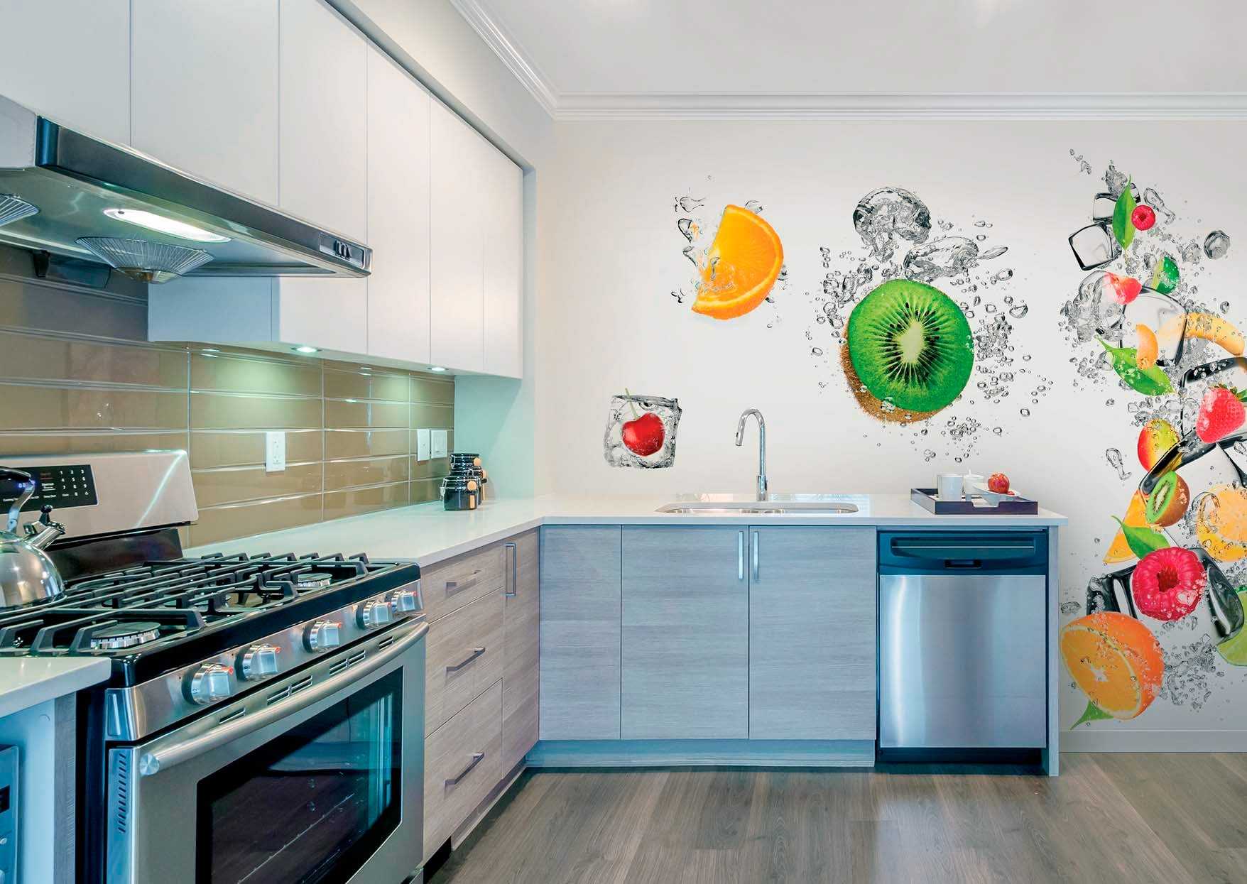 Разработка новых технологий для производства фотообоев позволила выпускать их в водостойком, легко моющемся, не впитывающем запахи варианте, причем с сохранением красоты и яркости изображения, так что их присутствие в интерьере кухни теперь скорее закономерность, нежели исключение.