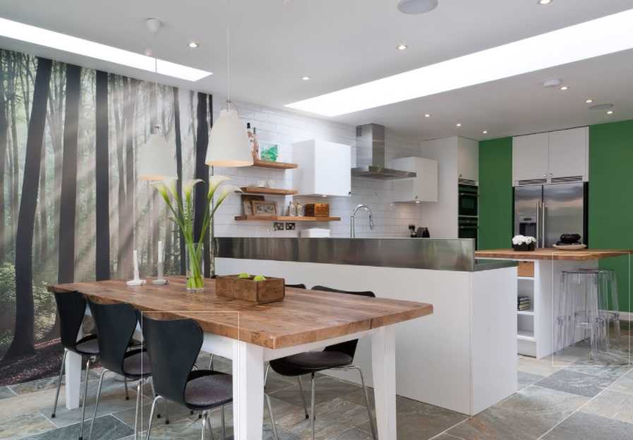 В отделке современных кухонь дизайнеры используют следующие виды фотообоев: