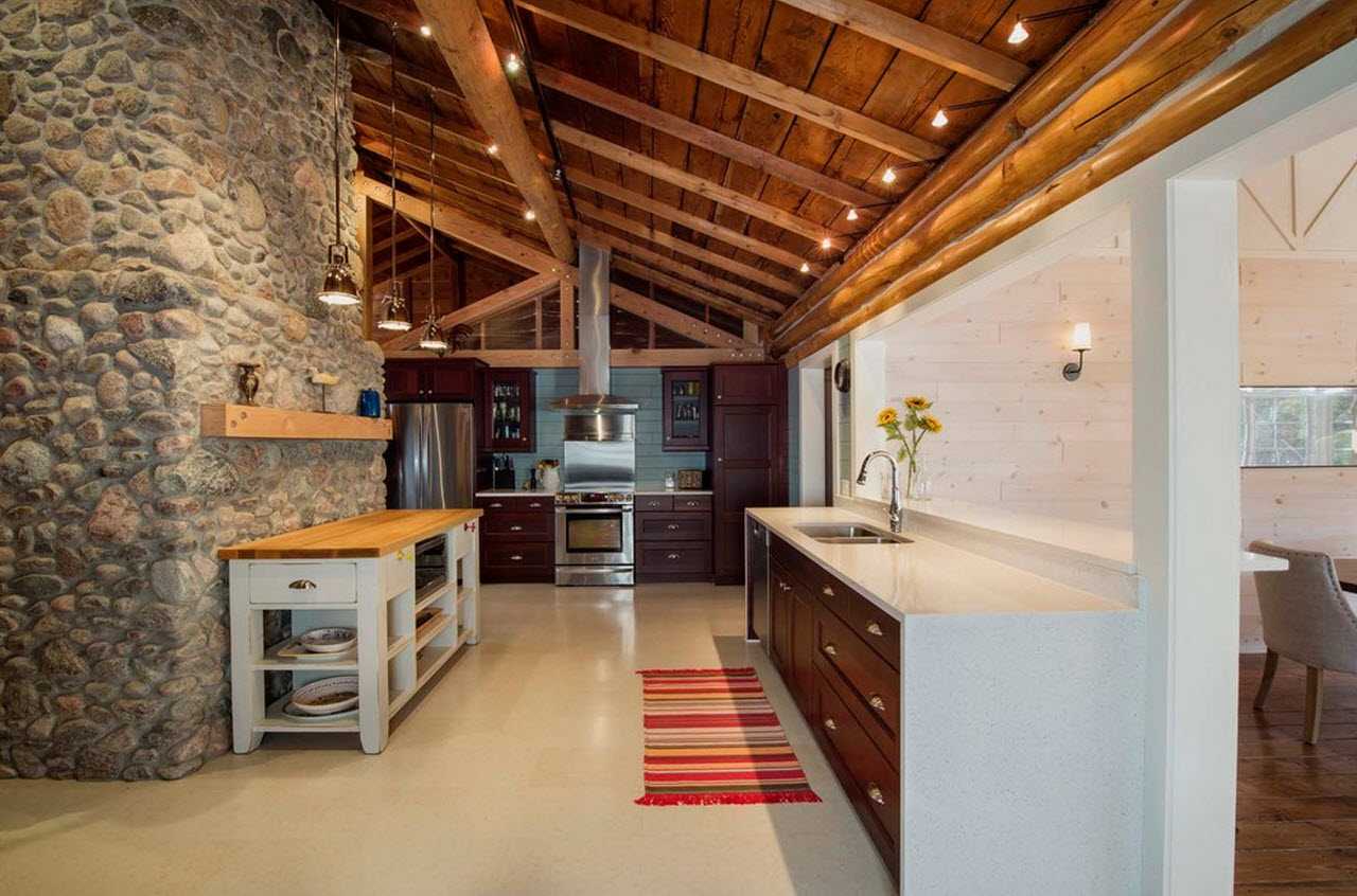 Горная хижина вдохновила дизайнеров на создание этой кухни с каменными стенами (от Montana Reclaimed Lumber).