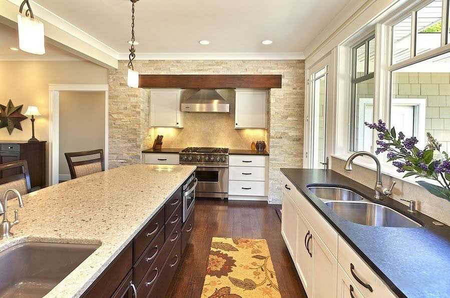 Нестандартная комбинация двух различных видов камней может создать уникальную и, главное, очень привлекательную кухню (от Hendel Homes).