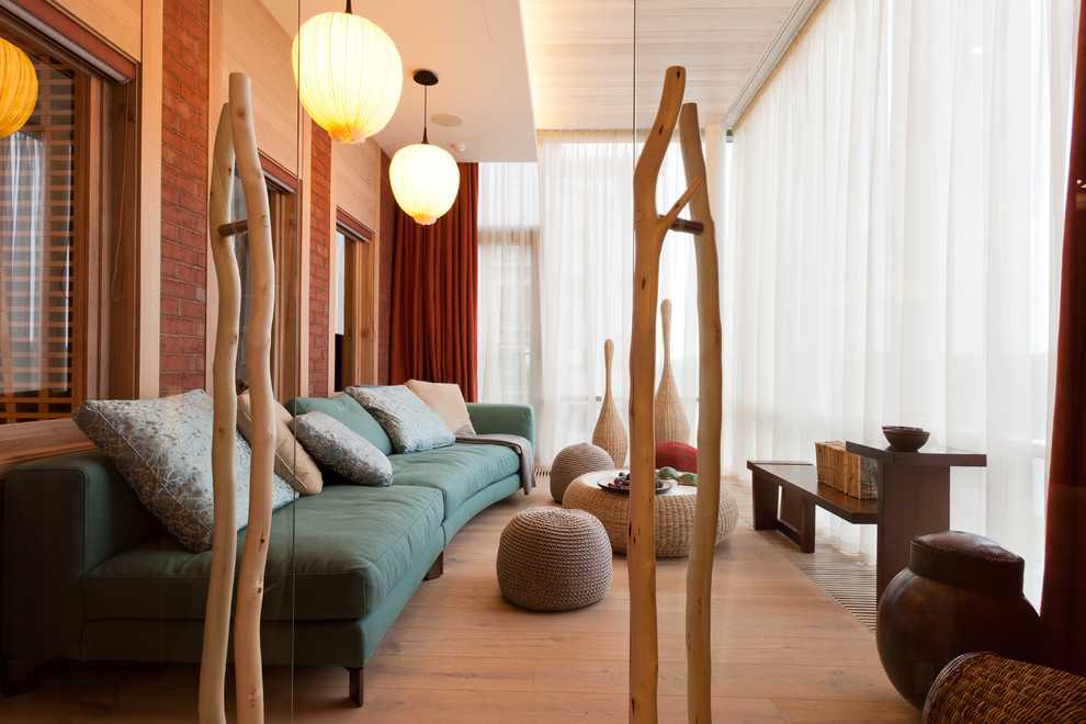 Вместо кресел можно поместить скамью, небольшую тахту или диванчик. Не менее органично будет выглядеть зона отдыха в восточном стиле. Вместо мебели набросайте много мягких подушек. Сделайте откидной столик, но уровнем ниже, чтобы удобно было доставать сидя на полу.