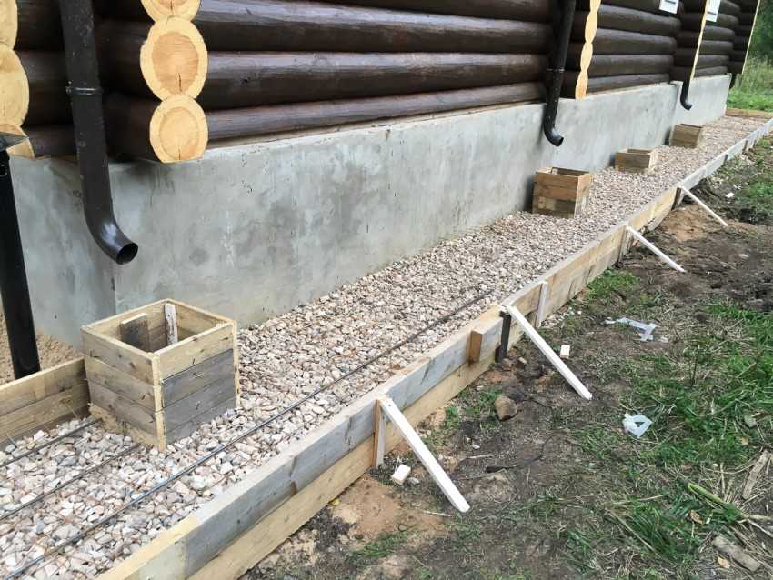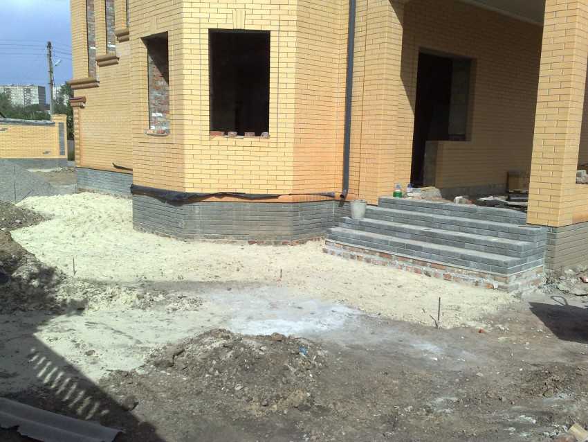 Дно траншеи устилается геотекстилем плотностью от 150 г/м³ или другим плотным гидроизолирующим материалом с нахлестом на стену в 30 см и опалубку. Следующий слой – крупнозернистый песок, толщина которого после трамбовки виброплитой или ручным приспособлением, должна составлять не менее 20 см. Затем вокруг дома укладывается слой щебня или гравия до 10 см.