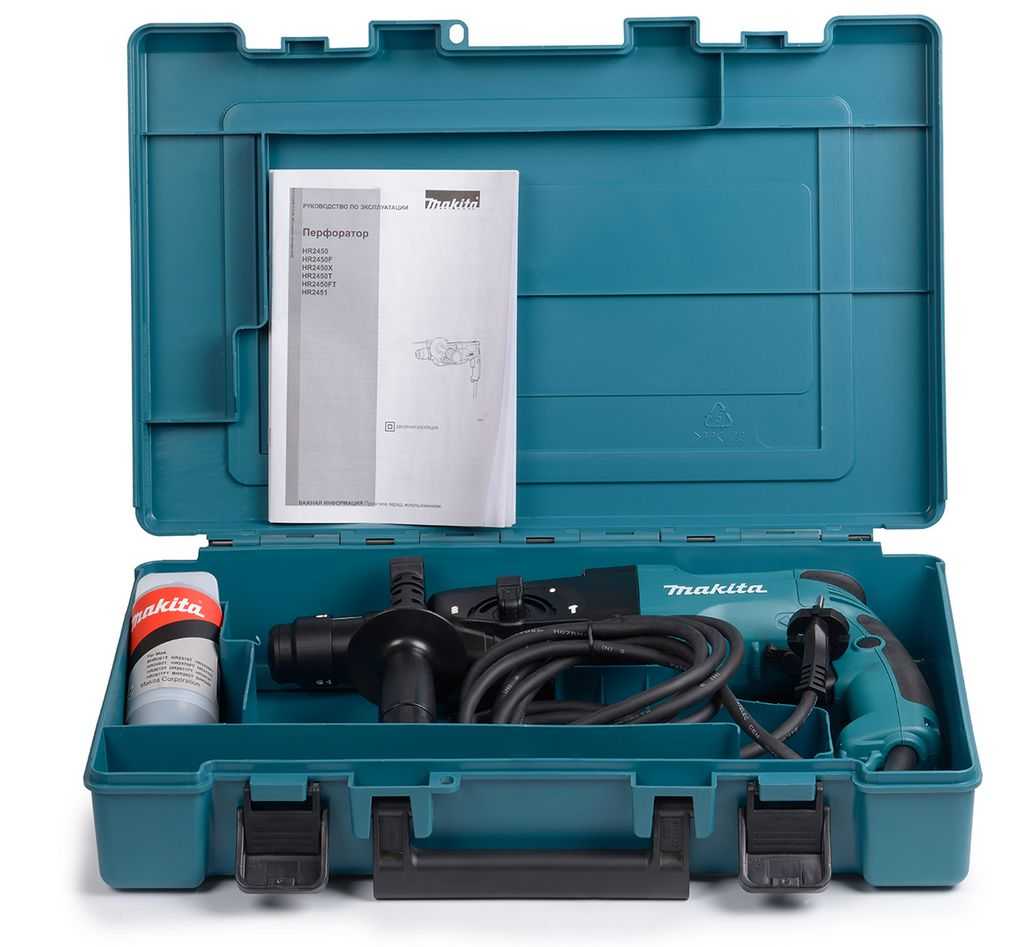 Комплект поставки Makita HR2450 достаточно скромен: сам перфоратор, дополнительная ручка, ограничитель глубины, две краткие инструкции на русском и английском языках и гарантийный талон. Разумеется, поставляется он в удобном фирменном кейсе, где есть пара отсеков для ключевого патрона, смазки, буров и т.п.
